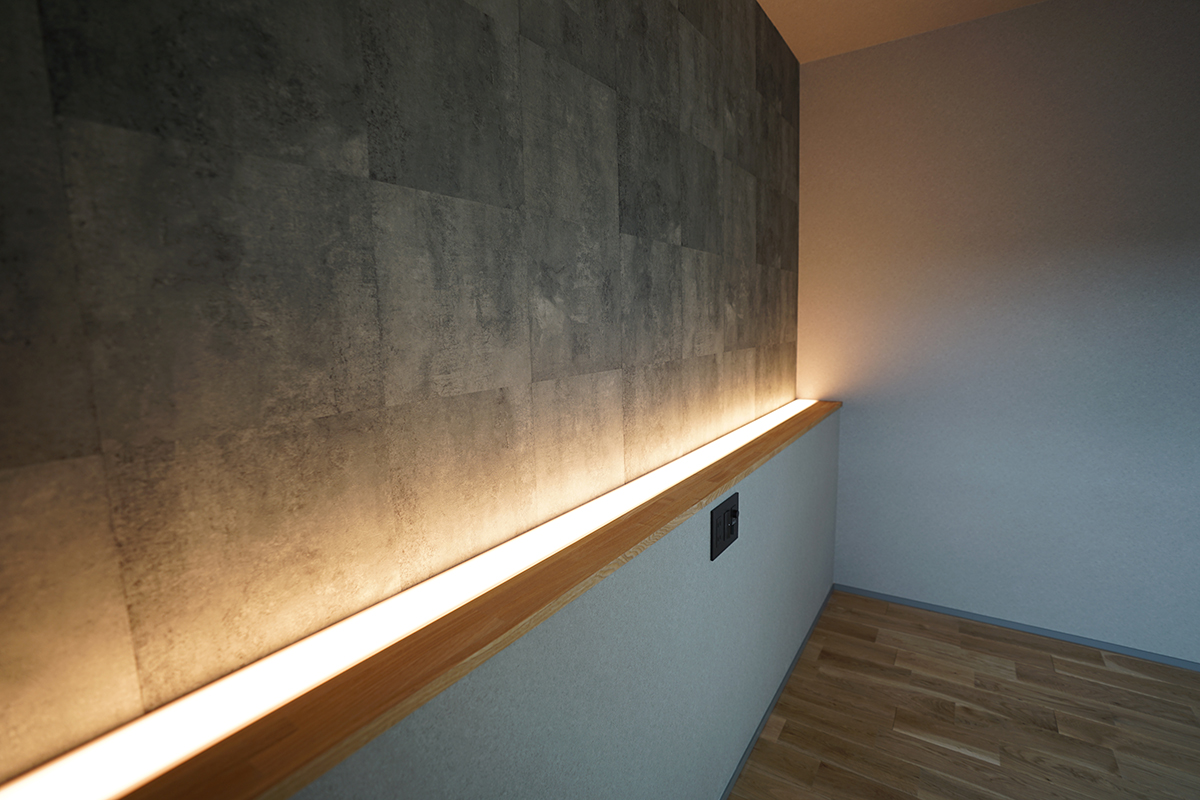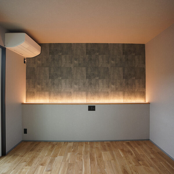 寝室にはアクセントクロスと間接照明でモダンなかっこいいイメージ