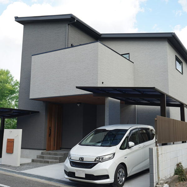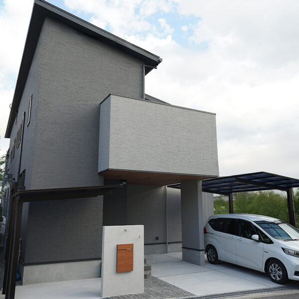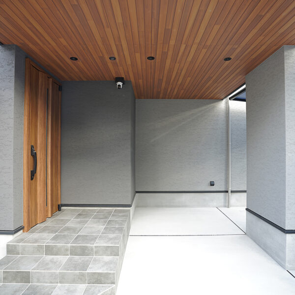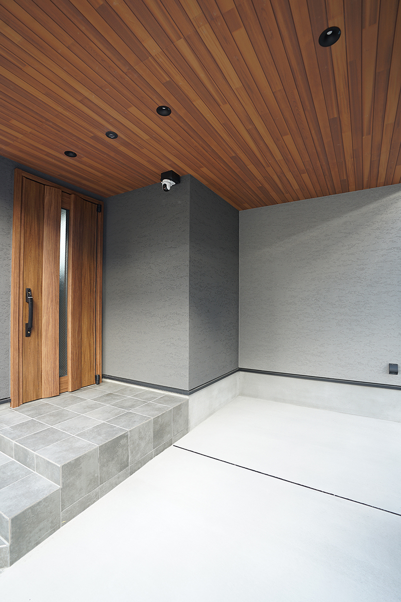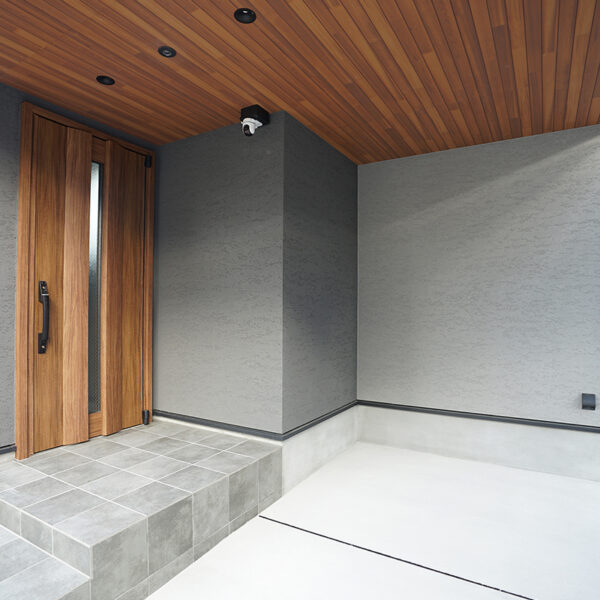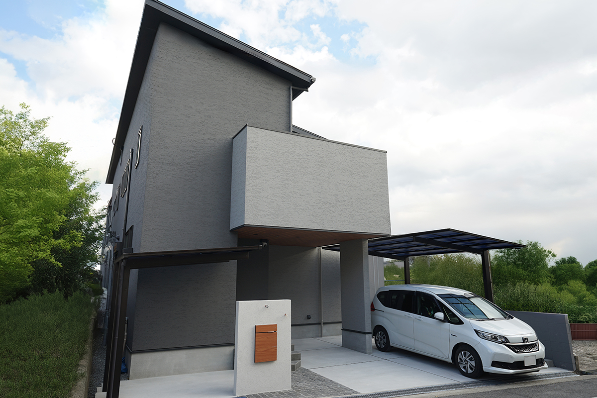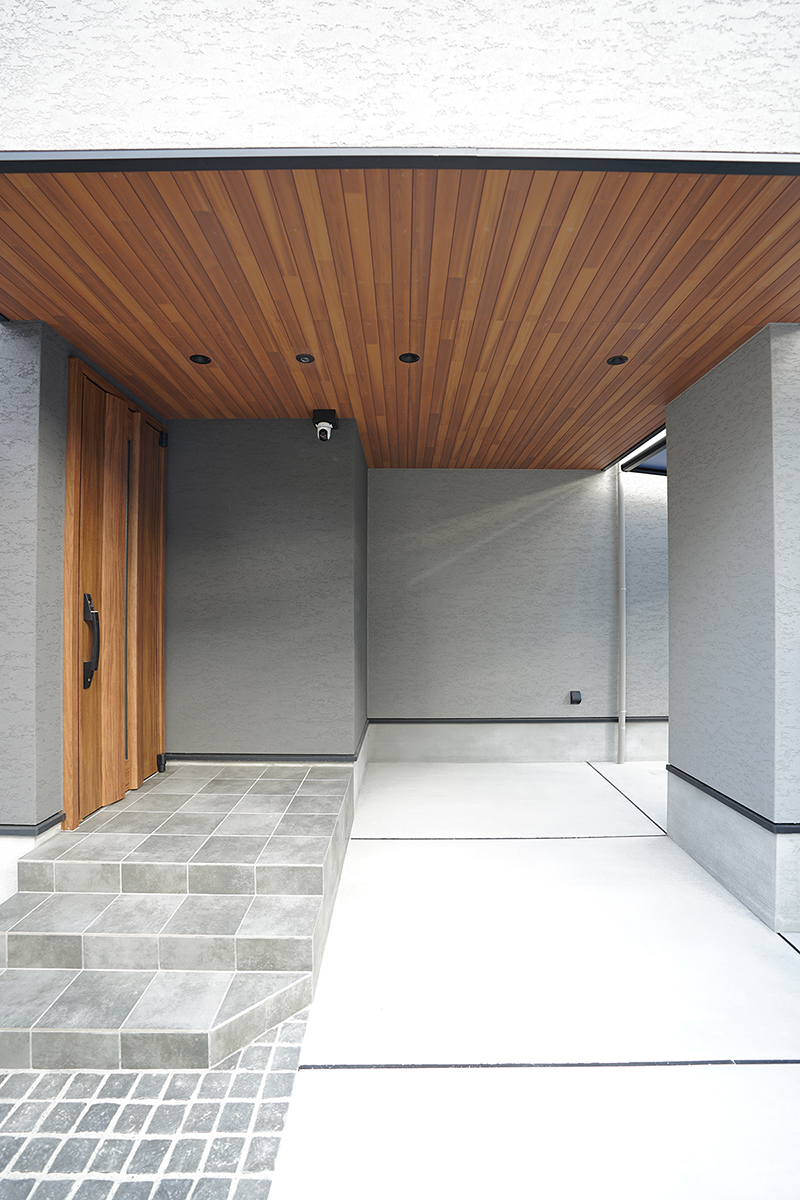 グレイのジョリパットの外壁にアルテザートの木目の軒天がかっこいい外観。