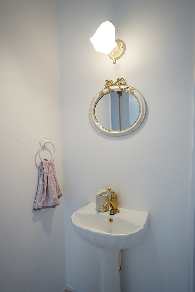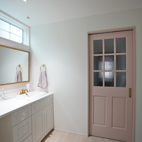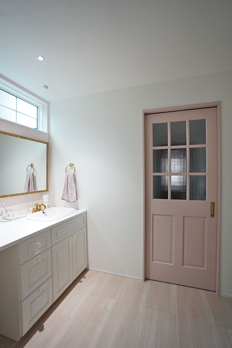 中に入ると淡いピンクのドアが迎えてくれます。